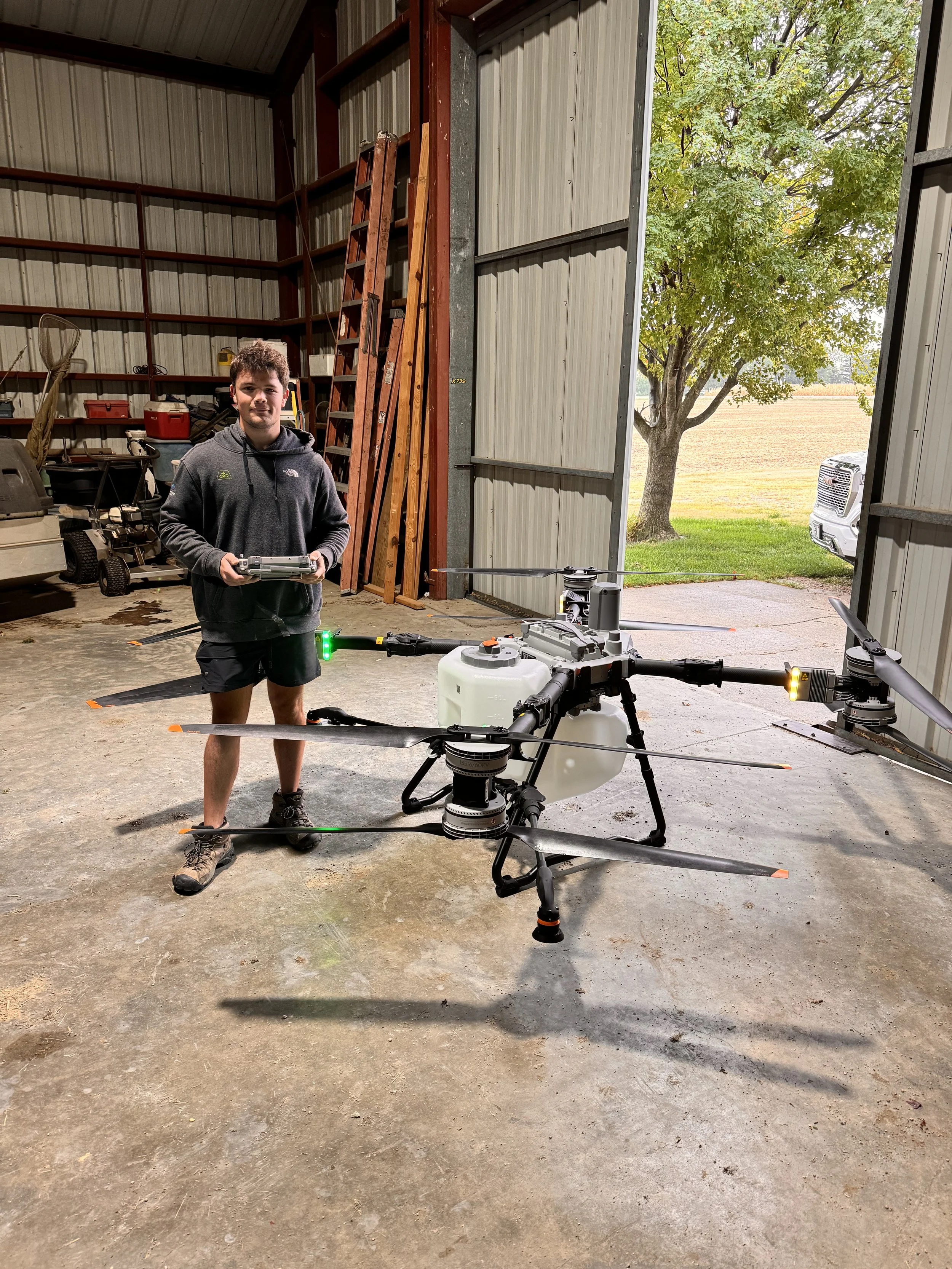 Velocity Drones LLC: We’re FAA Part 137 certified applicators running dual DJI Agras T-100 drones. We specialize in fungicide application in corn and soybeans. We also can spray other pesticides, spread fertilizers/seed, and also lift parts to and from the field.